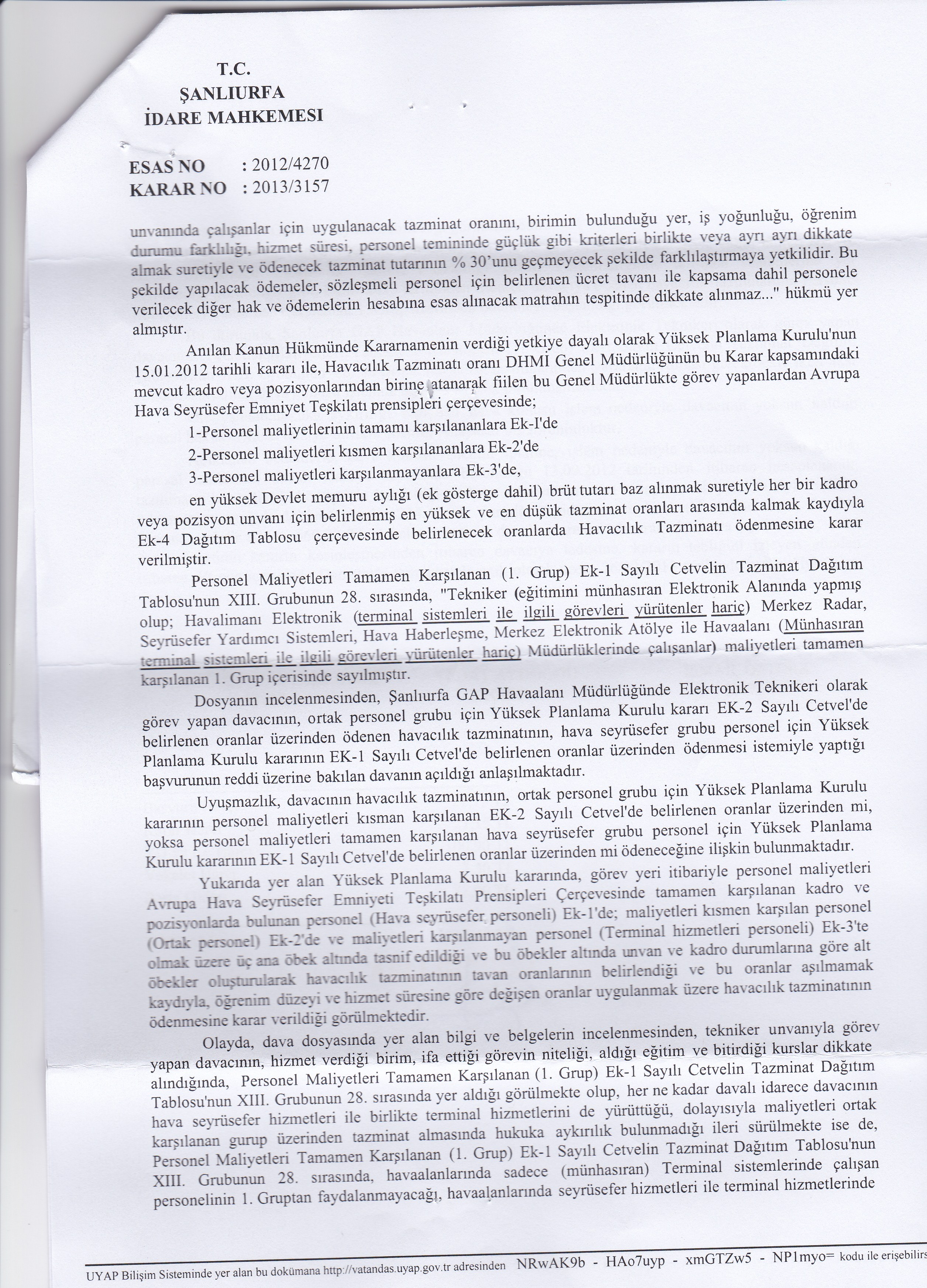 Şanlıurfa GAP Havalimanı Müdürlüğünde Elektronik Teknikeri olarak görev yapan üyemiz adına Sendikamız tarafından açılan dava ile; daha önce 1.grupta yer almakta olup, bu grup için belirlenen havacılık tazminatını almakta olan üyemiz daha sonra ortak gruba düşürülmesi nedeniyle tazminat miktarında düşüş olmuştur. Bu durum üzerine üyemiz kuruma yaptığı başvuru ile havacılık tazminatının personel maliyetinin tamamının karşılandığı EN ROUTE 1.Gruptan ödenmesi talep etmiş, bu talebin kurum tarafından reddi üzerine Şanlıurfa İdare Mahkemesine açılan davada Mahkeme Sendikamız lehine karar vererek idare işleminin hukuka aykırılığı belirterek bugüne yoksun kaldığı parasal hakların yasal faiziyle ödenmesi gerektiğine karar vermiştir.